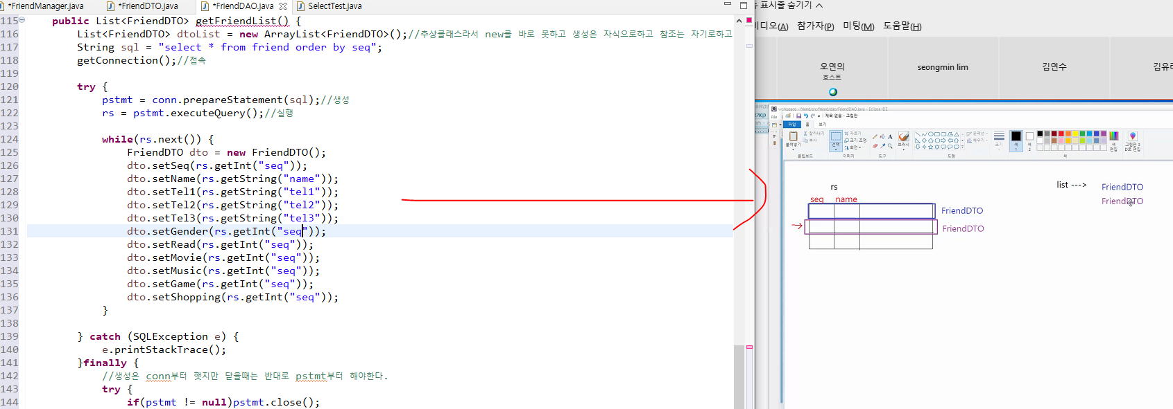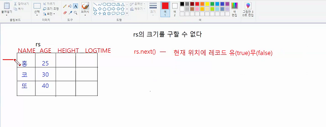 rs.getSring("name") ;/ rs.getString(1); 을하면 name의 값을 꺼내온다. -> 홍, 코, 또