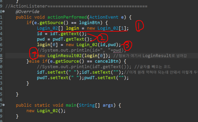 1번 Login_02.class를 속성으로 하는 배열 을 만든다. 보면 이 클래스에 필드와 기본생성자, getter가 있다. 2번 textfield에 있는 글자를 가져온다(get) 3번 가져온 글자를 만들어둔 배열에 넣는데 1개만 있고 먼저 만들어둔 기본생성자 모양처럼 Login_02(id, pwd)이렇게 저장을 해준다. 4번 그리고 같은 패키지에 있고 public으로 만든 클래스 LoginResult02에 값을 파라미터로 보내준다. 파라미터에 넣어준 login[0]에는 id와 pwd값이 있다. 여기서 더 나아가면 메세지, 성별, 뭐머ㅜ 등 다양한 정보를 입력받거나 생성자로 넣어서 본 |