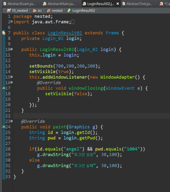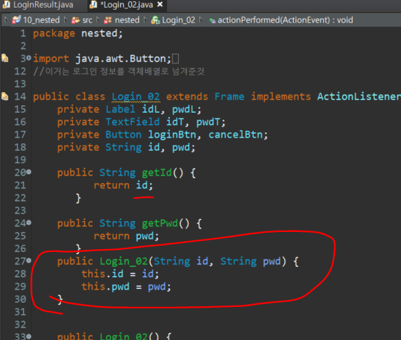 그리고 Loginresult의 필드부분에 Login_02의 속성을 가진 login을 만들어서 값을 저장할 준비를 한다. 그리고 기본생성자를 통해 값을 받아와서 this.login = login을 통해 이 클래스에 값을 받아왔다. 이제 저 login객체에는 id와 pwd값이 들어있다. 그래서 paint메소드에 login.getId();를 통해 id값을 빼올 수 있다. 여기서 getId가 가리키는곳은 |