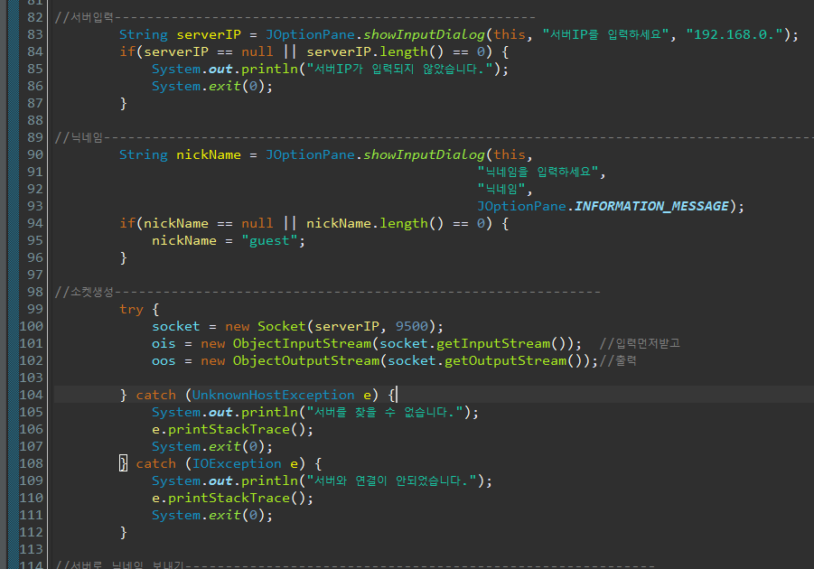 oos = new ObjectOutputStream(socket.getOutputStream());//출력스트림이 먼저 잡혀야지 입장메세지가 나온다.