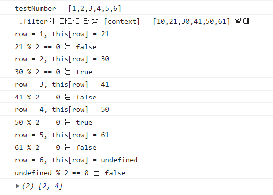 console.log("_.filter의 파라미터중 [context] = [10,21,30,41,50,61] 일때");